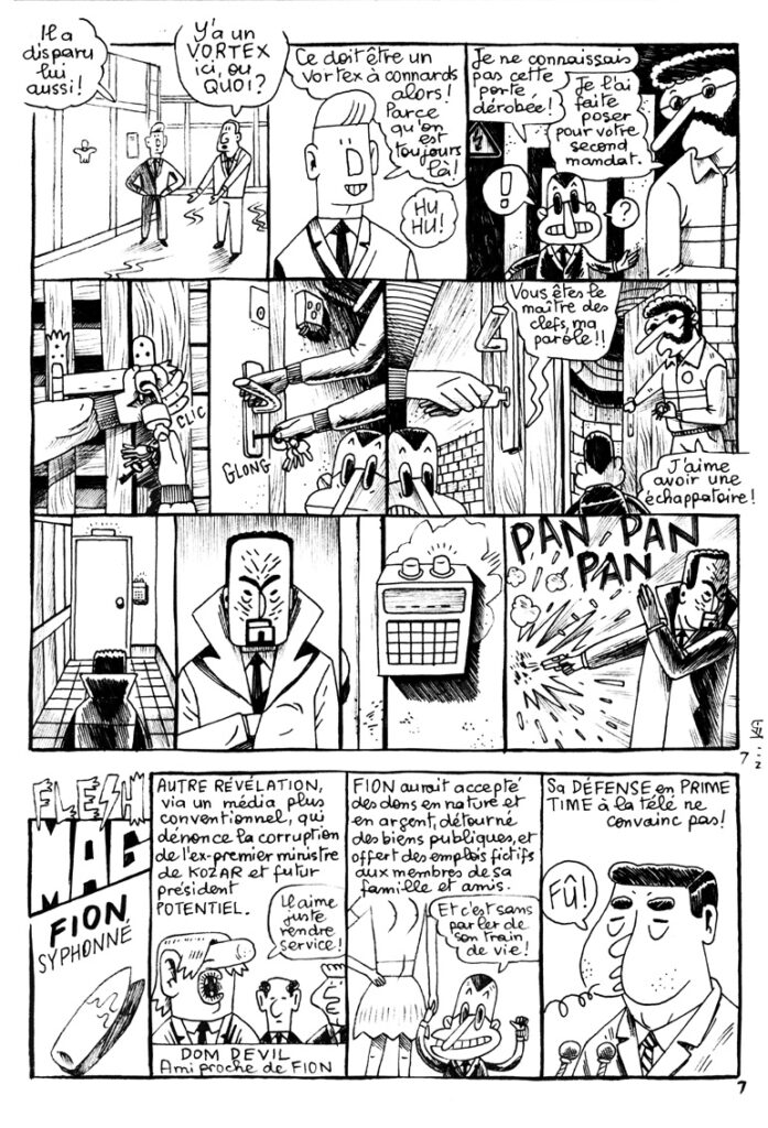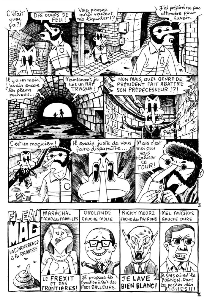 L’album sur lequel je travaille actuellement se nomme: MACR’HOP! PRÉSIDENT. Il s’agit d’une grande aventure de ZE « VIOLENT » KÖP et d’un double album pour l’électron libre de la branche armée de la justice. Dans cette première partie, MACR’HOP! le magicien devient président du royaume de France et, fort de son pouvoir, élimine la concurrence. L’ex-président KOZAR, aidé par KÖP, est forcé à l’exil. KÖP, lui, est rétrogradé. À l’ancien petit monde de KÖP viennent s’ajouter du nouveau monde: Les HOP!STES: MACR’HOP!, BRIDGET, BEN LALA, CASTAGNÈTE; Et les KÖPISTES: CHARLIE, PEDRO, SWITTY ainsi que toute une galerie de personnages secondaires. Face à une population colérique, violente et sans avenir, KÖP devra user de tout son talent pour sauver sa peau et la France.